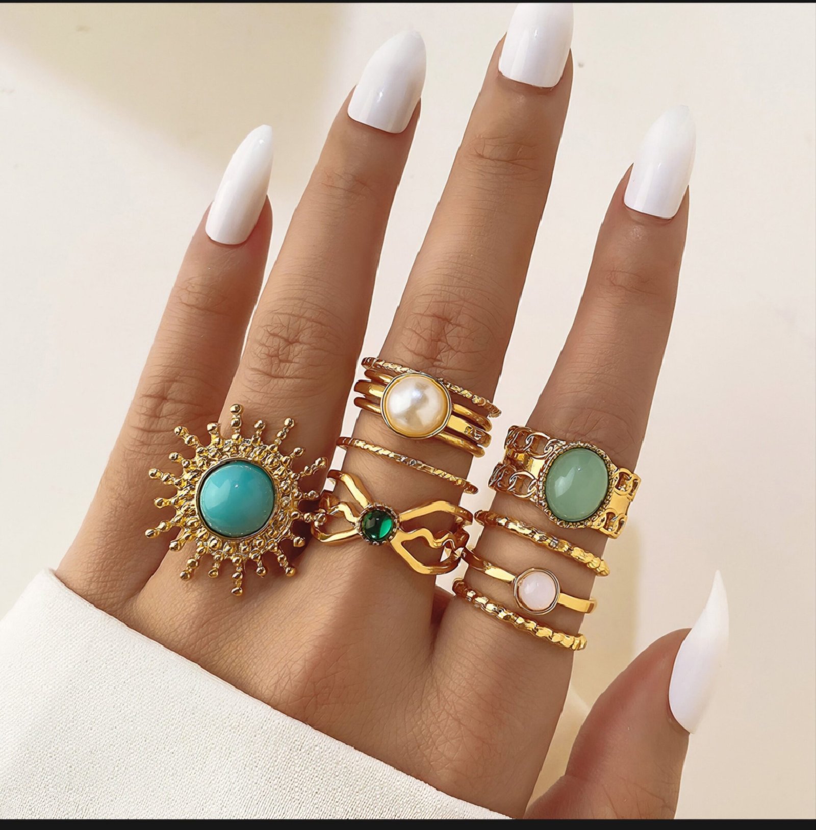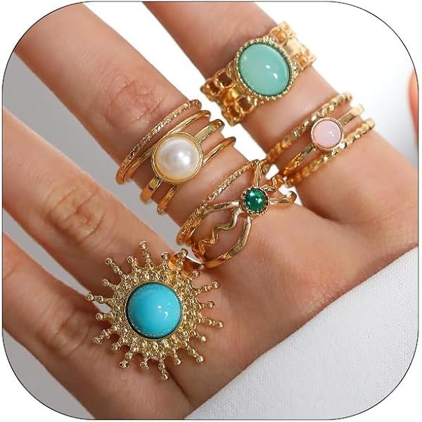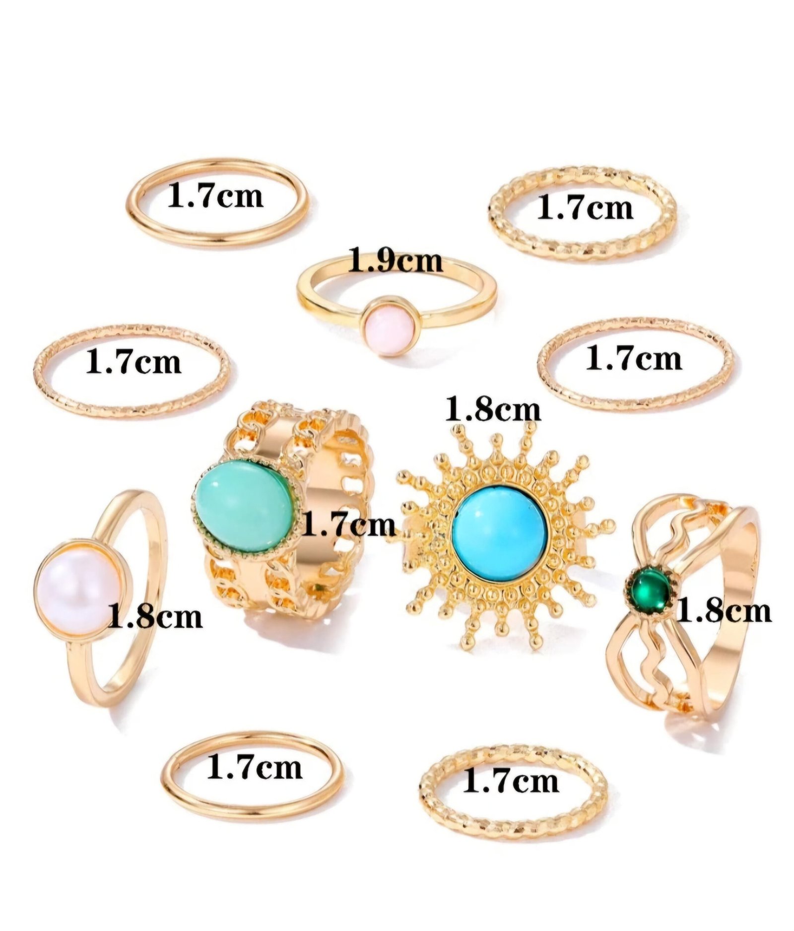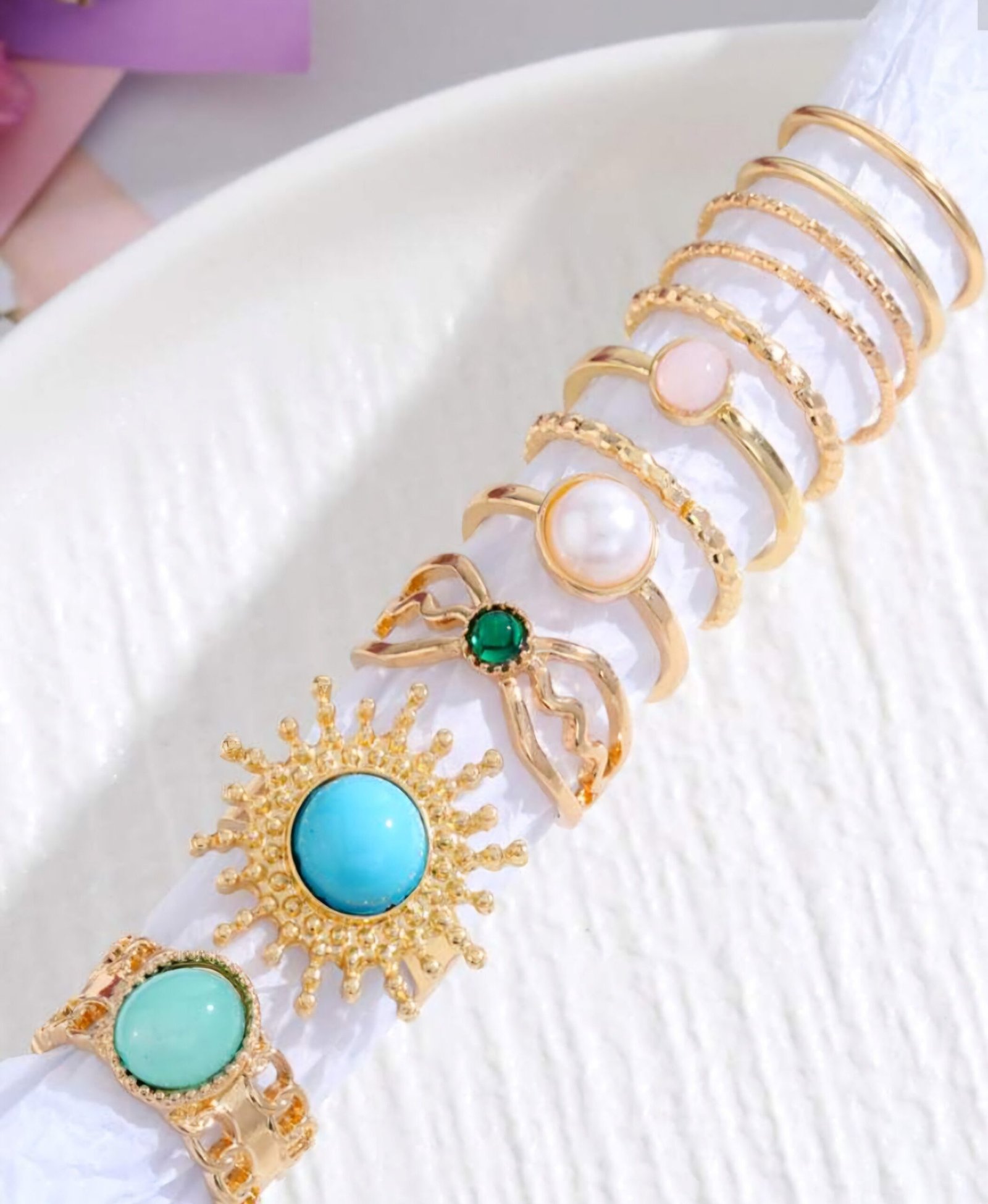 11pcs Elegant Vintage Gold Ring Set with Turquoise, Pearl & Gemstone Accents – Alloy Party Gift Ring Set for Women and Girl