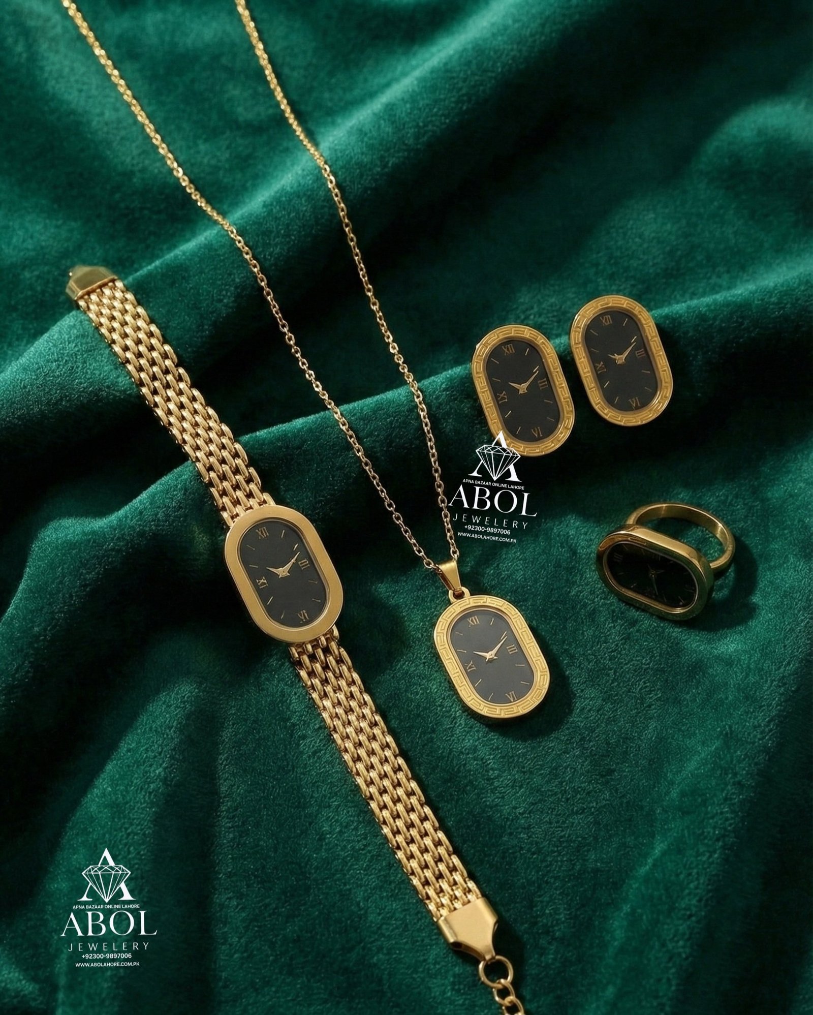 Elevate your style with this stunning Stainless Steel Jewelry Set, featuring a timeless Roman Numeral clock-face design in elegant black and gold-tone plating.